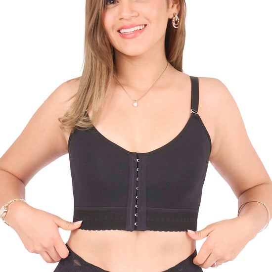 Brasier postquirúrgico de compresión media que brinda soporte, moldeo y realce natural en busto. Confeccionado en Powernet suave y forro hipoalergénico, cuenta con tirantes ajustables y triple nivel de broches frontales. Mejora la postura, reduce la inflamación y ofrece máxima comodidad durante el día a día.