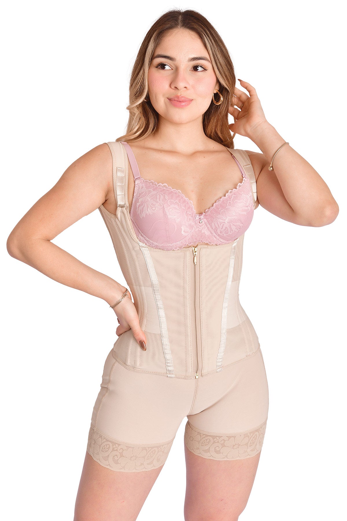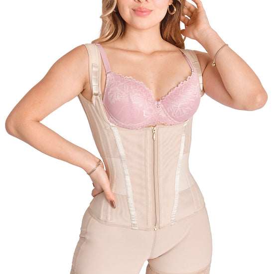 · Faja tipo chaleco de alta compresión, fabricada en powernet con forro de algodón suave. Incluye tirantes ajustables con almohadilla, 15 varillas metálicas flexibles y broches frontales de tres niveles. Moldea y reduce la cintura, mejora la postura y disimula los rollitos de la espalda. Ideal para uso diario.