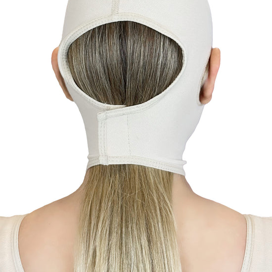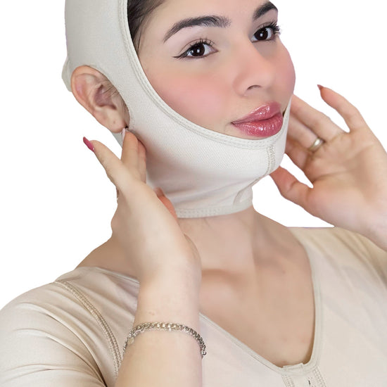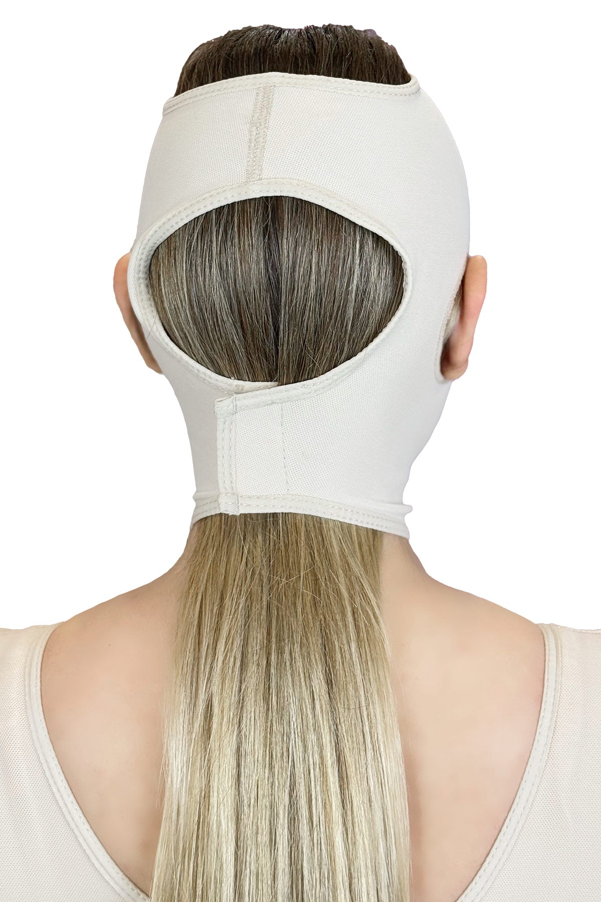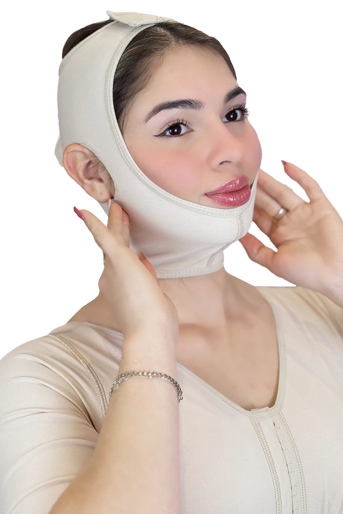 Prenda postquirúrgica de Powernet que brinda compresión firme y cómoda en mentón, mejillas y cuello. Ayuda a reducir la inflamación, definir el contorno facial y favorecer la adherencia de la piel tras procedimientos estéticos o quirúrgicos, adaptándose perfectamente al rostro sin causar molestias.