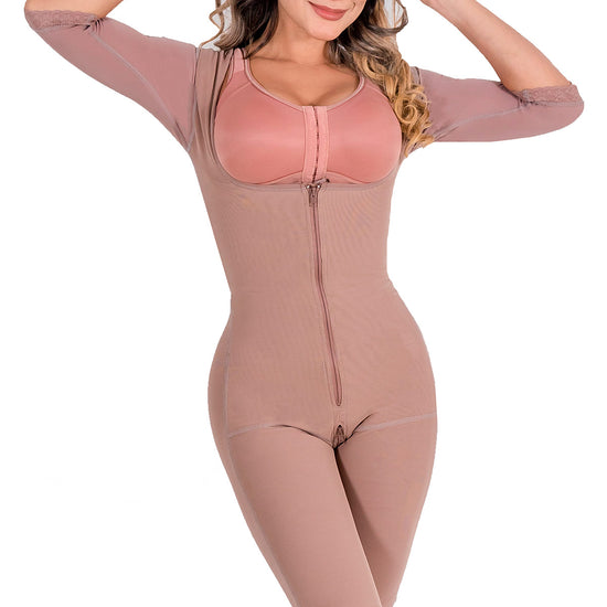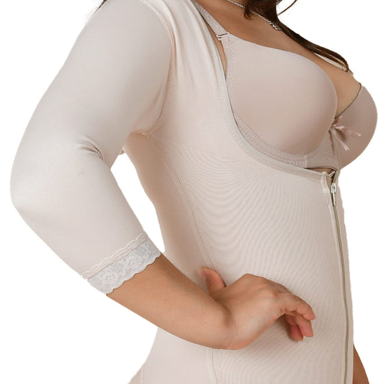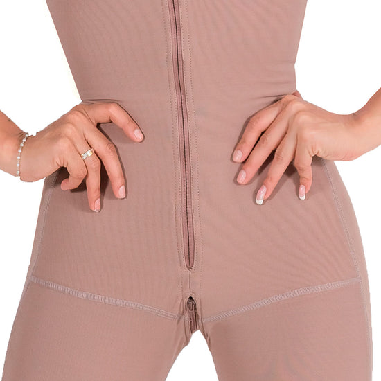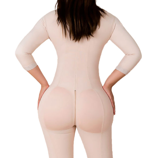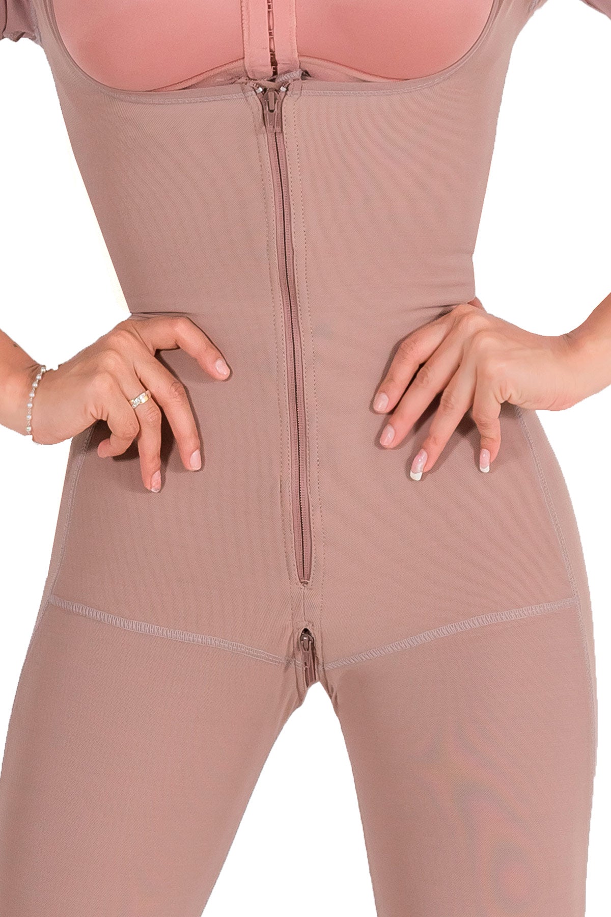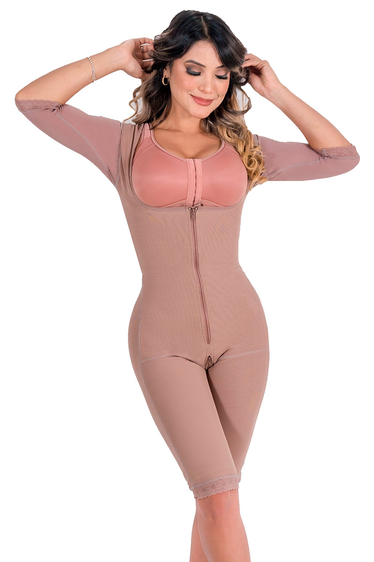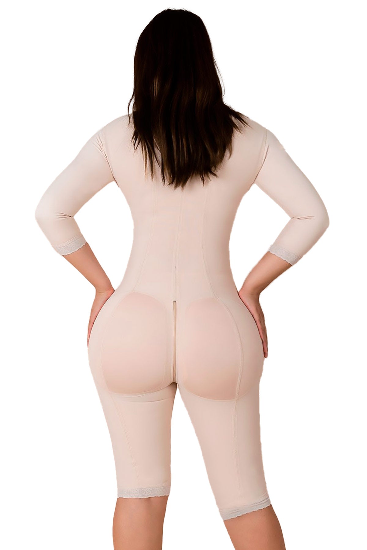 · Faja post quirúrgica de media pierna fabricada en powernet de alta compresión con forro de algodón hipoalergénico. Ofrece control en abdomen, cintura y muslos, reduce inflamación y mejora la postura. Con mangas ¾, cierre frontal y perineal, ideal para uso postoperatorio o post parto, brindando soporte, comodidad y silueta definida.