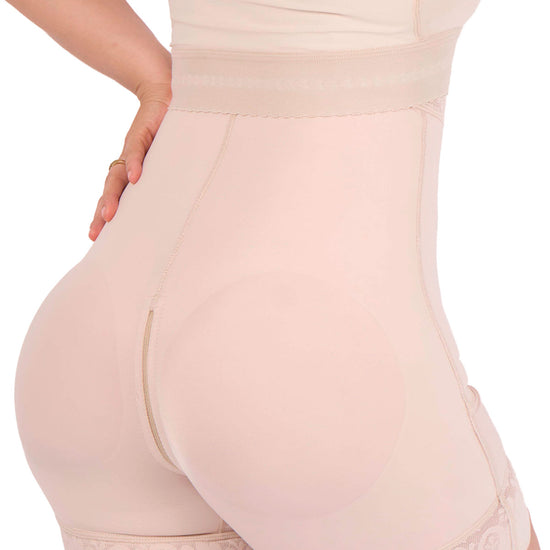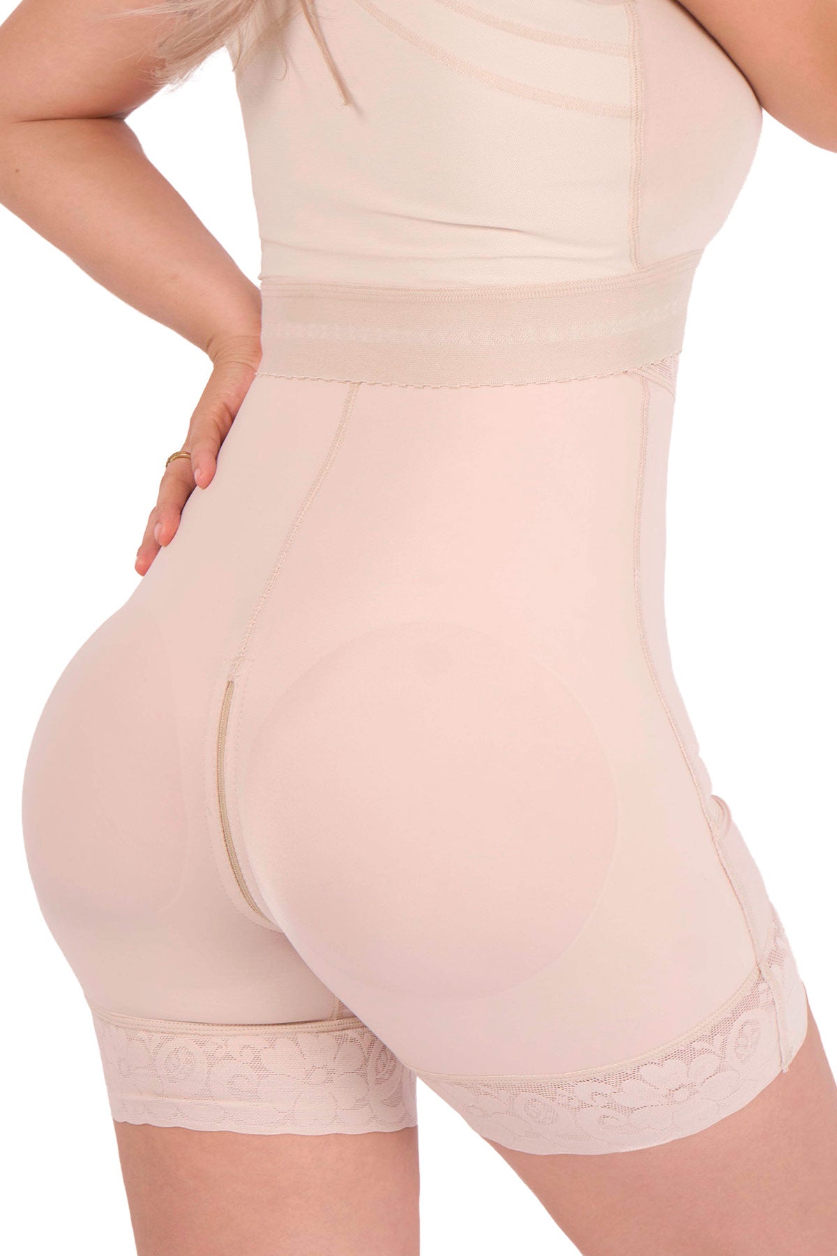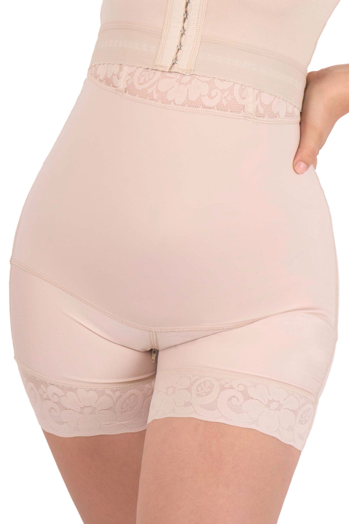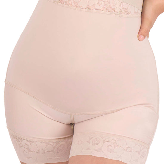Faja short de mediana compresión con doble refuerzo abdominal y realce en glúteos que moldea la figura con suavidad y discreción. Su tela lisa sin costuras visibles brinda firmeza cómoda, mientras el encaje siliconado evita que se enrolle. Incluye cierre perineal y costuras planas, ideal para uso diario y post parto.