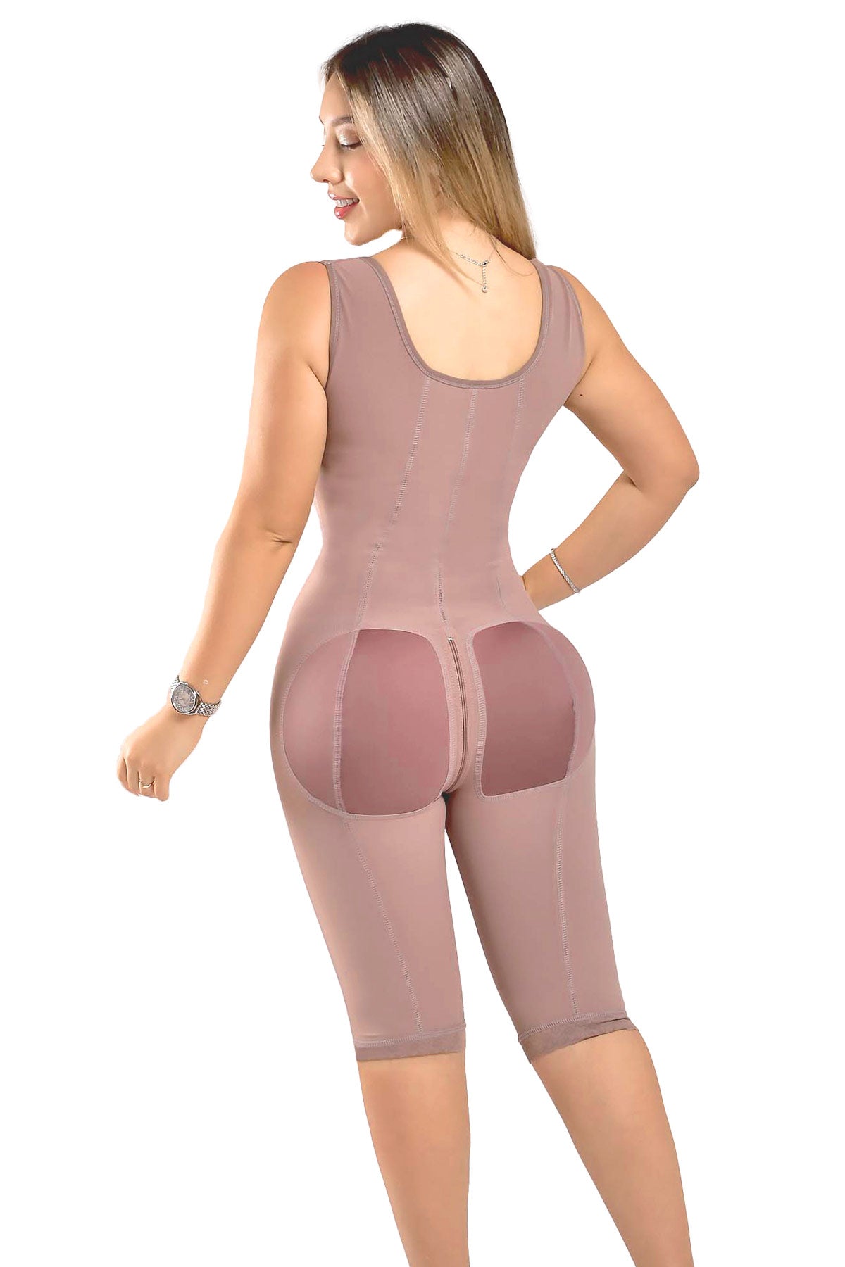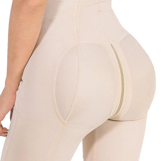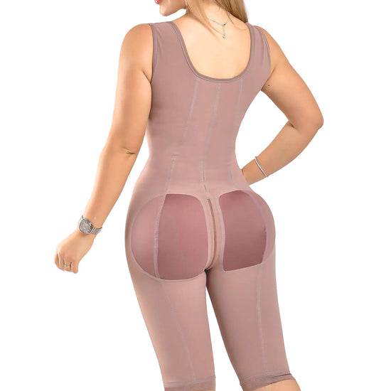 Faja de espalda alta con busto descubierto y corte hasta la rodilla, fabricada en powernet de alta compresión y spandex suave que moldea abdomen, cintura y espalda. Su diseño con mangas tipo sisa estiliza brazos y mejora la postura, mientras el cierre frontal y perineal brindan comodidad total.