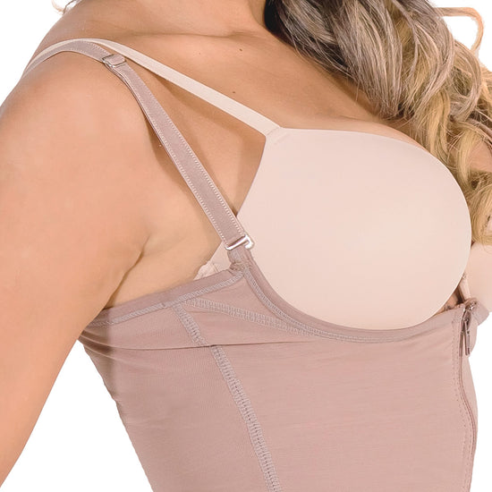Faja elaborada en Powernet de alta calidad con forro interno de algodón hipoalergénico. Su diseño de busto libre, tirantes ajustables y cierre frontal brindan control y comodidad, mientras su compresión inteligente moldea 360°, realza los glúteos y reduce medidas al instante sin perder frescura ni flexibilidad.